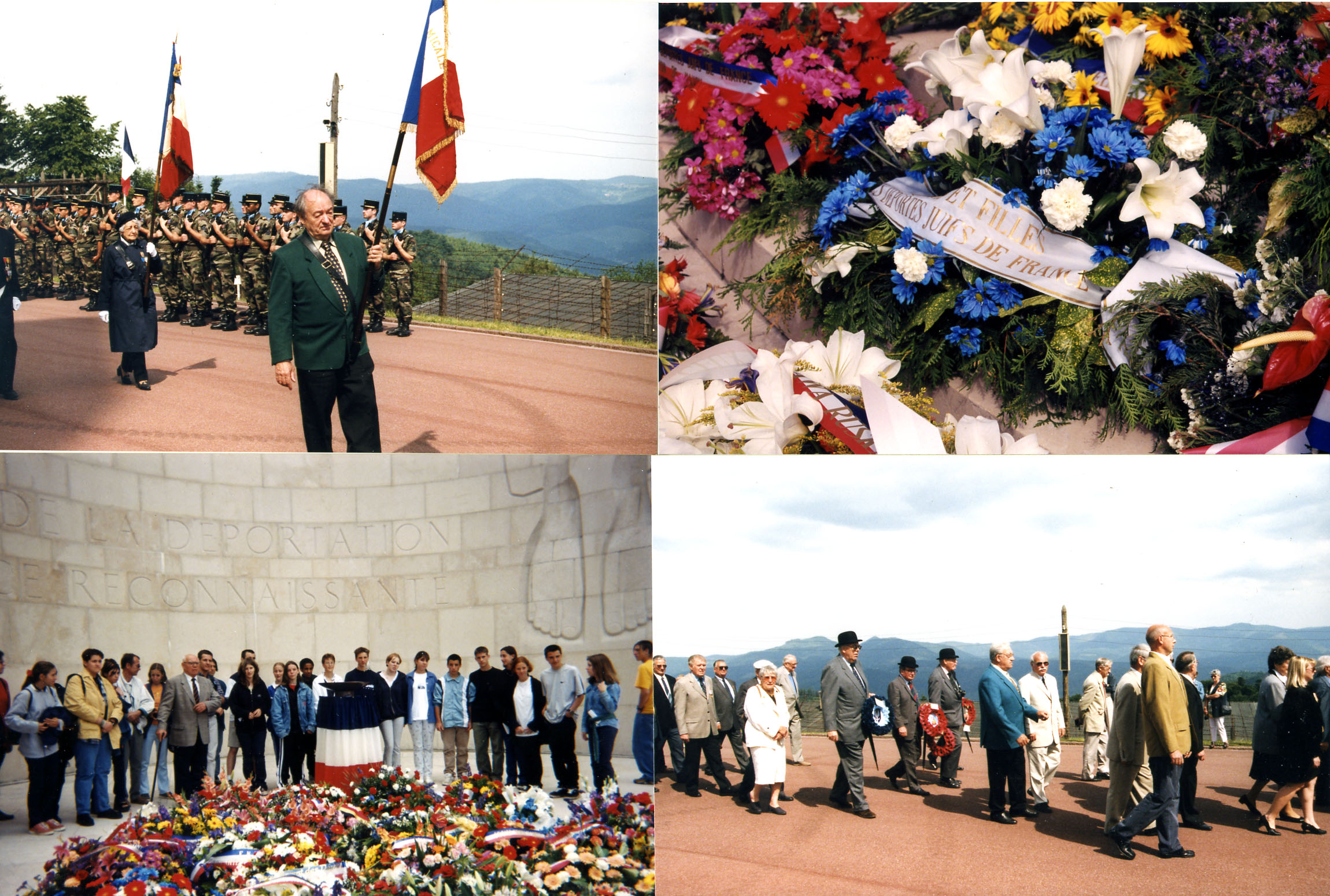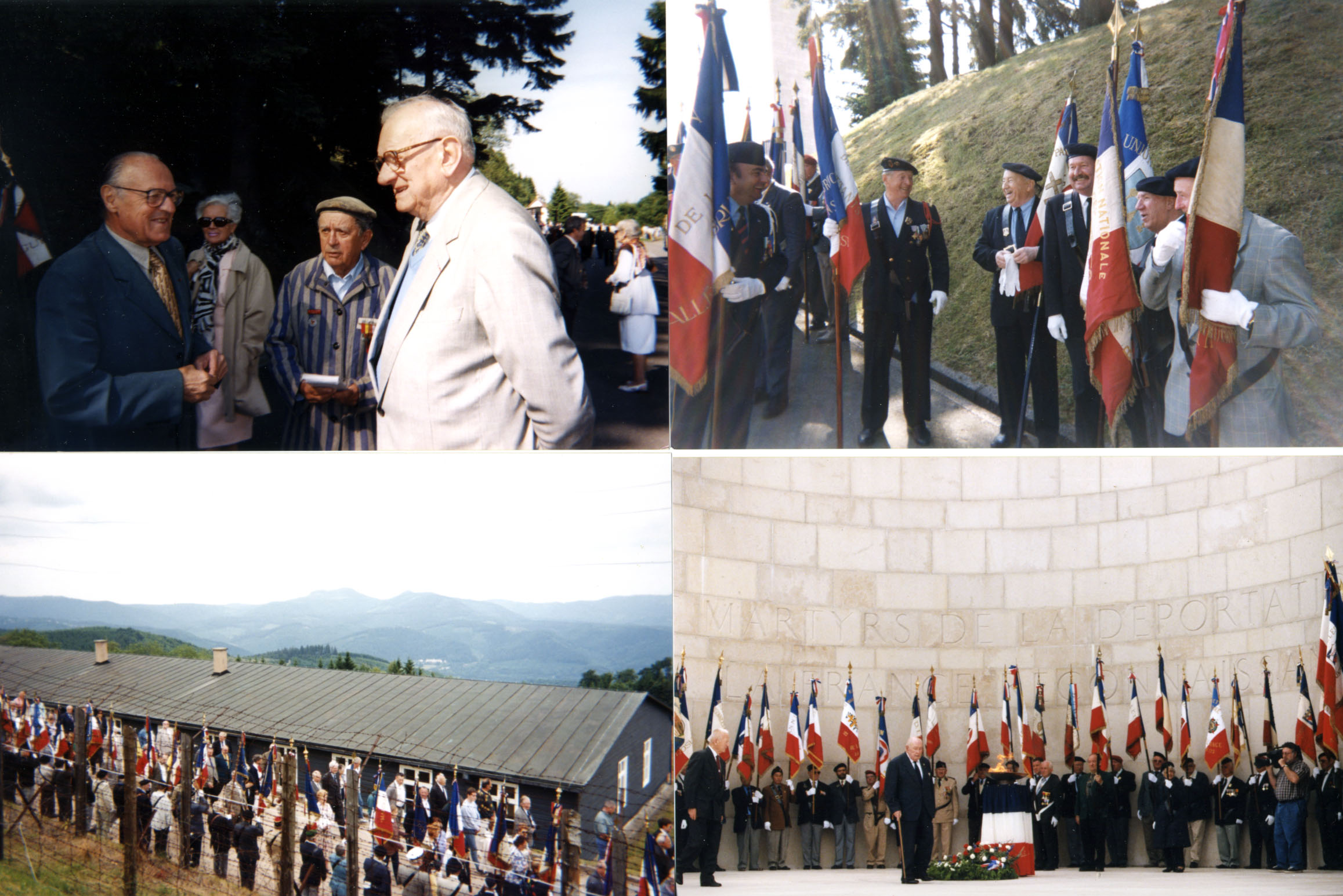 Dr. Lon Boutbien, survivor, at the foot of the monument; Gilbert May,left in small group, Jewish Maquisard from Alsace with fellow survivors of KLNa; survivors and their descendants sharing a pleasant moment before presenting the flags; procession begins its tour of the camp, starting at the top barracks. Photos and text copyright Diana Mara Henry.