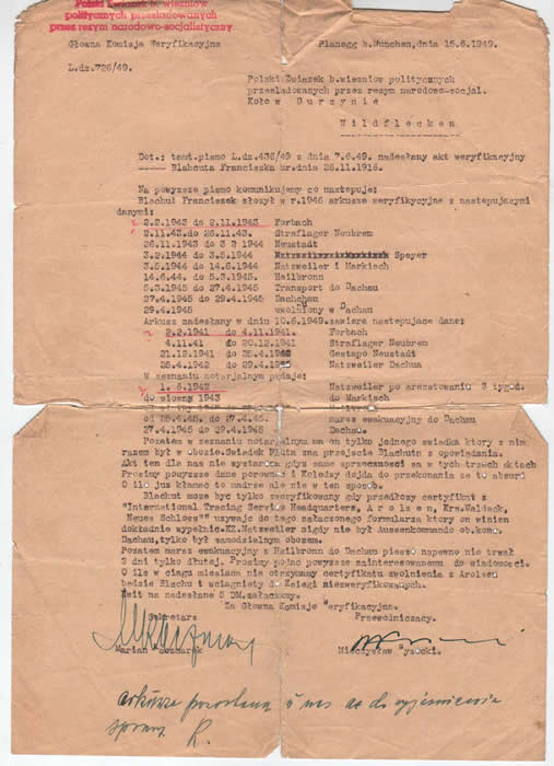 "My grandfather was [ ] at Natzweiler and later marched to Dachau. I thank god every day that he survived.[ ]His name was Franciszek Blachut (although in German it would have been Franz Blachhut) .... My father never even knew that his father was in Natzweiler until I told him. Whilst my grandfather had no qualms talking about Dachau and the gestapo in general- he never spoke of NAtzweiler where he spent years as opposed to days spent in Dachau. Thank you." C. Blachut, 12/8/2009