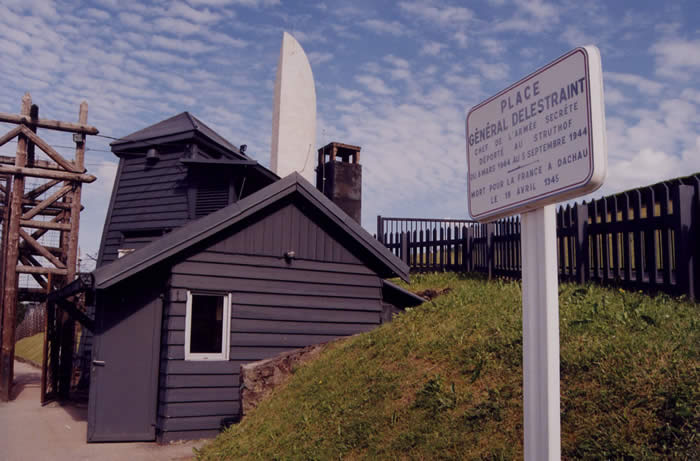 The sign posted by the entrance to the Natzweiler-Struthof camp reads: "General Delestraint Square. Head of the secret army, imprisoned at the Struthof from the 8th of March to the 5th of September, 1944. Died for France at Dachau, April 19, 1945." Delestraint, general in charge of the resistance movements within France during the German occupation, was removed from Natzweiler with all the other prisoners, in advance of the oncoming American troops, who discovered the camp, empty of prisoners, in November of 1944. He was shot just before the Americans liberated Dachau. Photo and translation Copyright © Diana Mara Henry.
