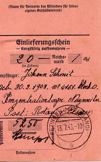 Jeanne Schmit writes: "This is a postal receipt for money transferred to father when he was in Natzweiler. Date July 13th, 1943. This is the original. |