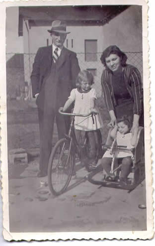 Jean and wife Marguerite (née Heintz) with their daughters, Georgette on the bicycle and Jeanne on the rocking horse, in 1941. |