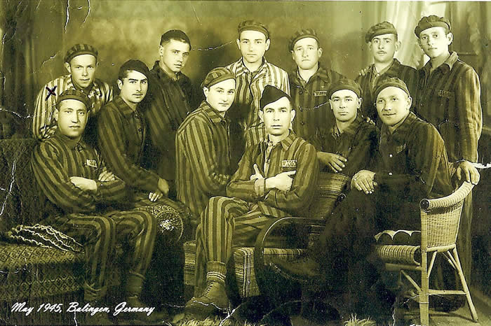 Their death march having been ended in Ostrach by "French soldiers in British uniforms driving American tanks", the prisoners returned to Balingen where this photo was taken on the 5th of April 1945, 3 days before the end of the war.It includes members of the team who worked at the garage: