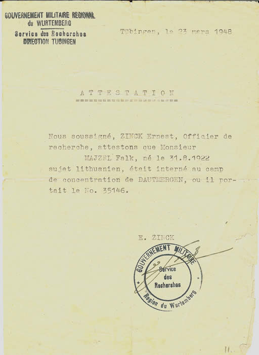 Phillip Maisel was an automotive electrician first in the shale oil extraction camps in Estonia for Lias-Olschiefer-Forschungsgesellschaft G.m.b.H. and then in the slave labor subcamps of Natzweiler, Dautmergen and Frommern, referred to in the ID dated May 12, 1945 above, signed by the Mayor of Ballingen.
