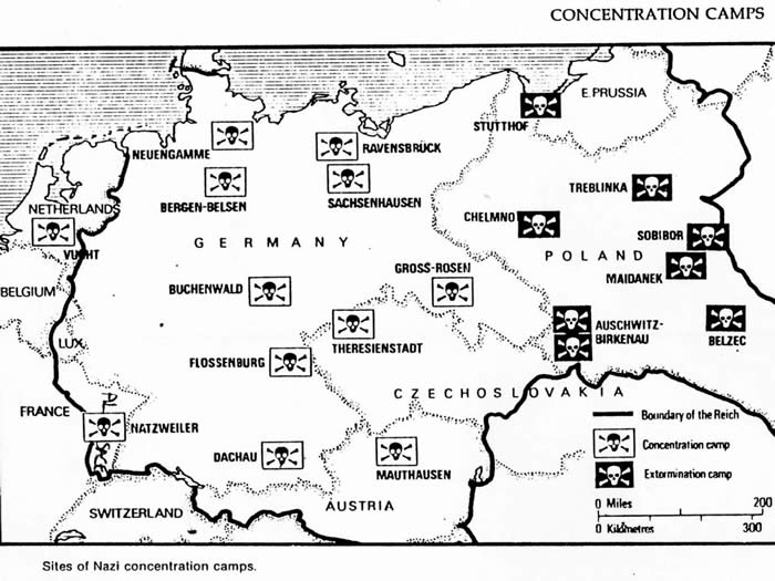 of the camp, out of view to the right. The barracks at bottom contain the prison, the dissection room and crematorium.