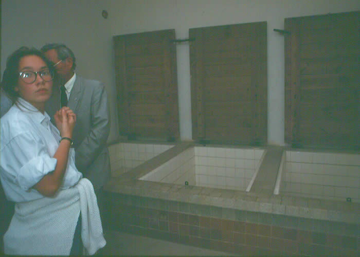Diners on the outdoor terrace from this distance and vantage point saw nude Jewish prisoners being herded into the gas chamber through the door on the left, where tourists enter it now.