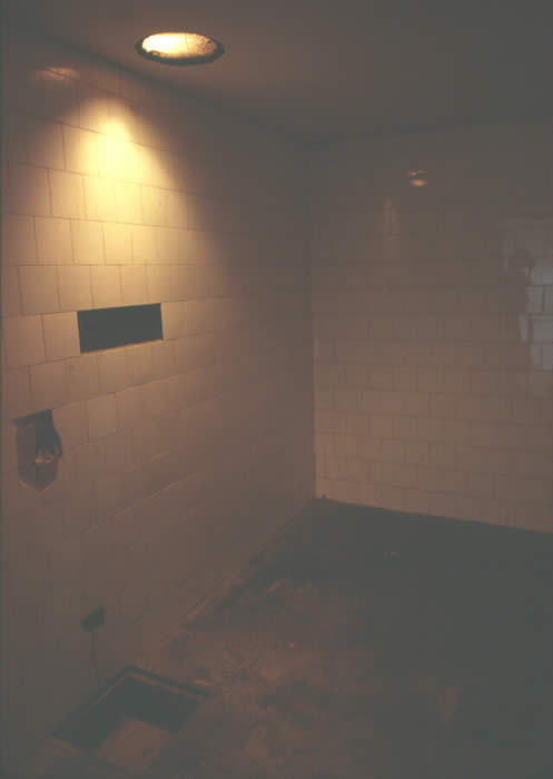 The following image, taken just to the right of the gas chamber,shows the tiled vats where partially dissected bodies were stored in preservative solution.