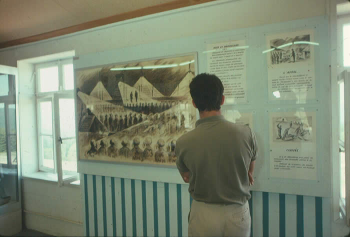 The exhibits include large displays of the drawings of Henri Gayot, a survivor of the camp. The large drawing this visitor is scanning is called "L'Appel" and shows a frequently occurring experience of all the prisoners being called out