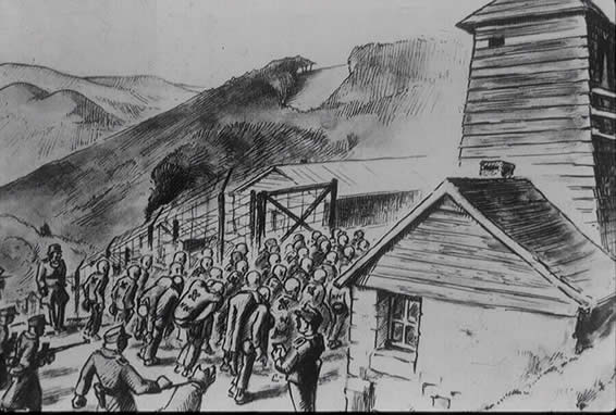 Drawings by survivor Henri Gayot of Natzweiler-Struthof concentration camp prisoners building the road to the camp