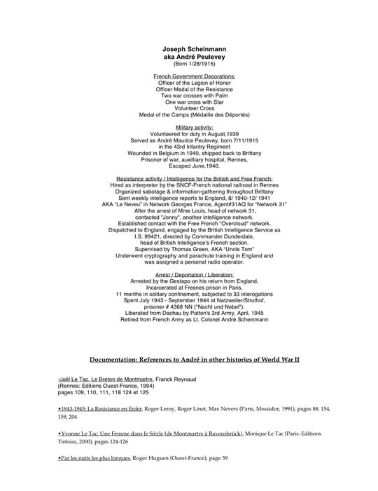 Not a member of a Jewish resistance per se, Joseph Scheinmann (AKA André Peulevey,) a German Jew originally from Munich, worked as a spy for the British MI6 and Free French networks